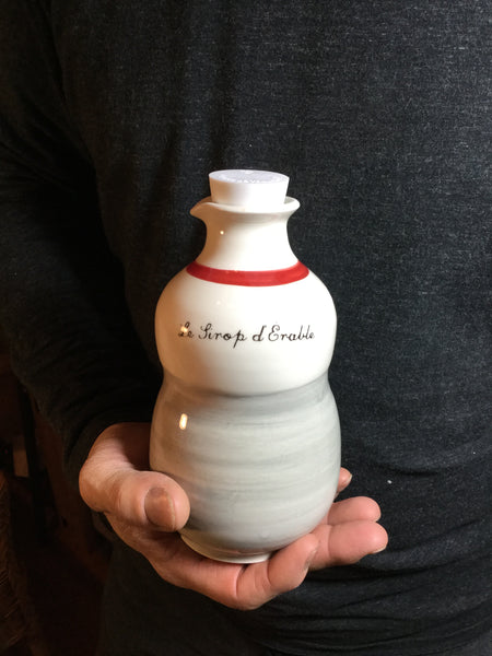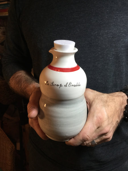 Pichet à sirop d’érable tourné à la main dans notre atelier de Montréal,Québec.inscription en français «  le sirop d’érable ». Avec design peint à la main motif bas de laine
